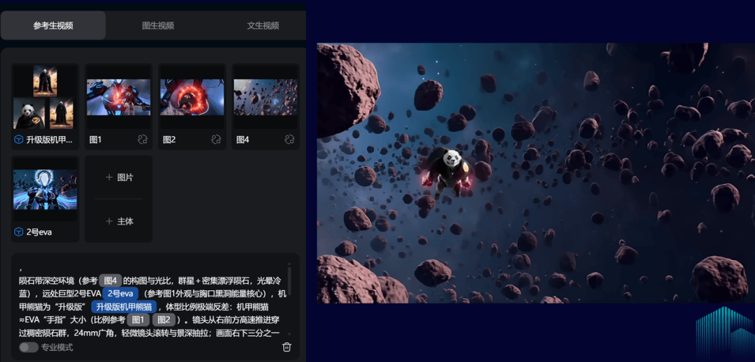 第五是熊猫侠和EVA两个画面从体的大小比例参考。曾经很是接近一部科幻超英片子质感。人类和机械人若何正在共存?现正在我们剪辑和前期出图、视频同步操做,以及该片的美术指点纸墨、剪辑指点PP,将全片沉剪成一部完整的90分钟AI科幻片子长片。